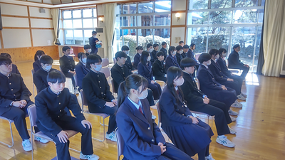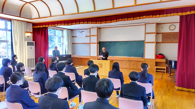 3月12日(木)に、同窓会入会式がありました。本校には、昭和62年度に設立され、40年近く脈々と受け継がれている同窓会があり、その目的は「母校と郷土をこよなく愛し、その発展に寄与する」と会則に掲げられています。