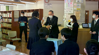 校長から一人一人に本を渡しました。(本は、生徒たちが個々に選んだものです)