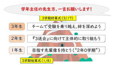 校長講話では、3学期の歩みを振り返るとともに、各学年主任が、生徒の成長について語る場面がありました。