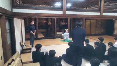 躍りの後は質問タイム。「なぜ舞妓さんになろうと思ったんですか?」「ヘアスタイルを保つのは大変ですか?」「お化粧にはどのくらい時間がかかりますか?」等々、たくさんの質問が出されました。