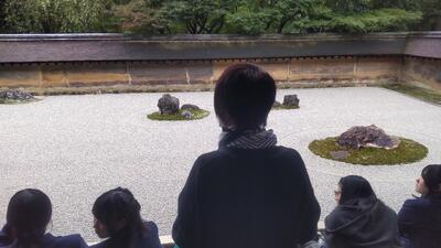 今回の修学旅行の最後の見学地「龍安寺」。雨も降るのを我慢してくれています。