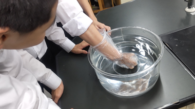 「水圧」を、水槽にビニール袋で覆った手を入れて体感する生徒たち。“握ったこぶしは開かない…?”