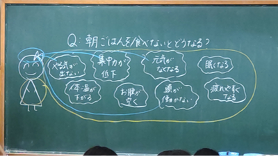 1年生は身近な生活場面から、「朝ごはんをたべないとどうなるか?」について意見を出し合っていました。