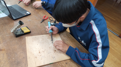 2年生は「はんだごて」の使い方に慣れるために、針金で思い思いの形を作って、はんだでつなげる活動に集中して取り組んでいました。