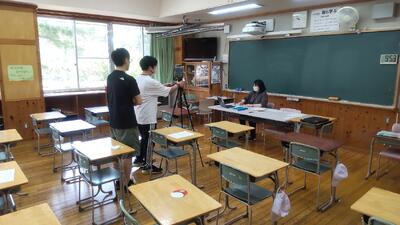 「みんながいないと寂しいなぁー」「おーい、元気?(←学級閉鎖をしているから元気じゃない…^_^;)」―画面に映る生徒たちに向けて話しかける職員。