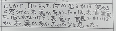 「“お(表)・う(裏)”が多いのは運」「明日やったら、他の方が多くなるかもしれない」の声がほとんどでしたが、その後の振り返りで考え方が変わってきた生徒も出てきました。