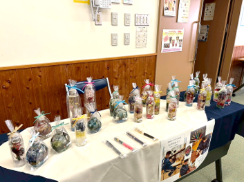 2月16日(月)に洗心学級の生徒たちが、上松町社会福祉協議会が“ふらっと自由に立ち寄れて、気楽なひと時を楽しめる憩いの場”を目指して定期的に開催している『にじいろcafe』に参加し、先日紹介した(2/13配信HP参照)ハ—バリウム作品の販売活動を行わせていただきました。お店(?)の名前は『SHIN-MARU』(どんな意味が込められているかはご想像ください)。