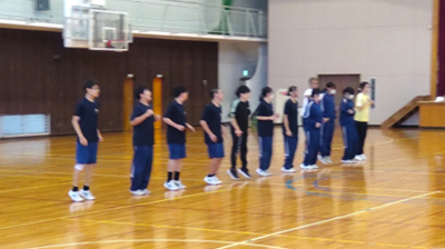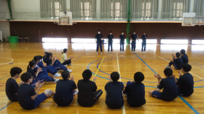前半は体育館で体を動かしました。一定のリズムでジャンプする生徒たちの後ろをNOBUさんが縄跳びで1人1回ずつ一緒に跳びながらずれていきます。
