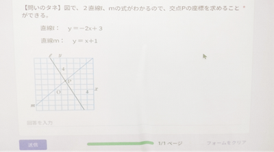『一次関数』の単元の中で次のような「問いのタネ」(「図で、2直線ℓ,mの式がわかるので、交点Pの座標を求めることができる。」)がまかれました。