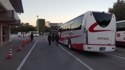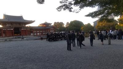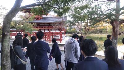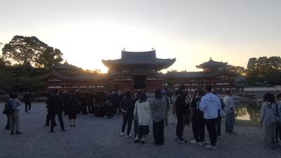 修学旅行記④ 投稿: 上松中 (10/29) 1日目最後の見学地は平等院鳳凰堂です。日が短くなり、薄暮の中での見学となりましたが、夕日を受けた社殿も粋なものでした。 ガイドさんから、鳳凰が翼を広げている形になっているのに左右の翼の部分はつながっておらず、独立しているとの説明を受け、"確かに!"と納得。 最後の見学を終え、これから宿舎に向かいます。みんな元気です👋