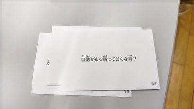 集中して、10分間で2つのミッションをクリアすることができました。次は「こころかるた」。これは様々な質問が書かれたカードを使って対話するコミュニケーションツールです。