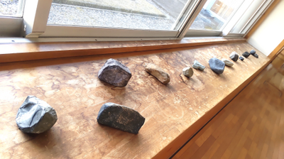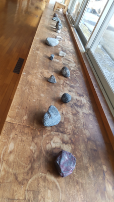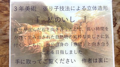 職員室前の廊下には、3年美術『私のいし』の作品が展示されています。